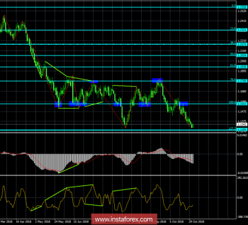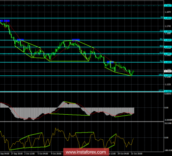 Пара EUR/USD выполнила разворот в пользу европейской валюты после образования бычьей дивергенции у индикатора MACD и отбоя от уровня коррекции 100,0% — 1,1303. В итоге начался процесс роста в направлении коррекционного уровня 76,4% — 1,1422. Новых назревающих дивергенций 1 ноября не наблюдается ни у одного индикатора. Закрепление курса пары под уровнем Фибо 100,0% сработает в пользу валюты США и возобновления падения в направлении уровня коррекции 127,2% — 1,1162.