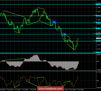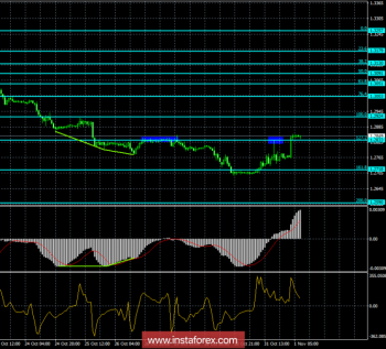 На 4-часовом графике, после образования бычьей дивергенции, котировки пары GBP/USD выполнили закрепление над уровнем Фибо 76,4% — 1,2813. Таким образом, процесс роста продолжается 1 ноября в направлении следующего уровня коррекции 61,8% — 1,2905. Новых назревающих дивергенций сегодня нет. Отбой котировок от уровня Фибо 61,8% позволит трейдерам ожидать разворот в пользу американской валюты и некоторое падение в направлении коррекционного уровня 76,4%.