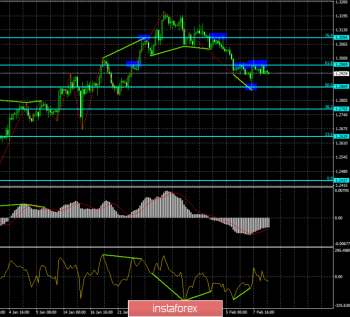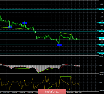 Пара GBP/USD на 4-часовом графике выполнила двойной отбой от уровня коррекции 61,8% — 1,2969 и разворот в пользу американского доллара. В итоге 11 февраля пара может выполнить возврат к уровню Фибо 50,0% — 1,2869. Назревающих дивергенций на текущем графике не наблюдается ни у одного индикатора. Закрытие котировок пары над уровнем Фибо 61,8% сработает в пользу английской валюты и возобновления роста в направлении коррекционного уровня 76,4% — 1,3094.