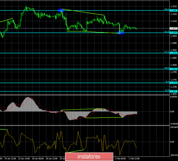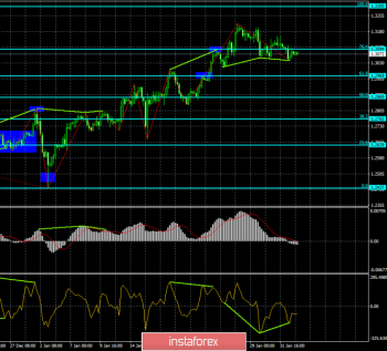 Пара GBP/USD на 4-часовом графике выполнила разворот в пользу валюты США и закрытие под уровнем коррекции 76,4% — 1,3094. Однако 4 февраля образовалась бычья дивергенция у индикатора CCI. Эта дивергенция позволяет рассчитывать на разворот в пользу валюты Англии и некоторый рост пары. Закрепление котировок над уровнем Фибо 76,4% повысит шансы пары на рост в направлении коррекционного уровня 100,0% — 1,3300. Прохождение последнего лоу дивергенции сработает в пользу продолжения падения в направлении уровня 61,8% — 1,2969.