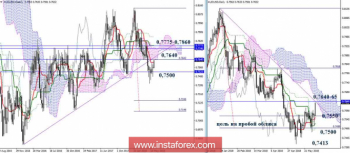 Отработанная дневная цель (0,7499), усиленная заключительным рубежом месячного золотого креста (0,7523), справилась с ролью поддержки и ограничения снижения на данном участке. В настоящий момент пара тестирует первые целевые ориентиры восходящей коррекции (недельный Тенкан 0,7613 + недельный Сенкоу Спан Б 0,7640 + дневное облако). Результат взаимодействия определит, смогут ли игроки на повышение продолжить подъём или же происходящее ограничится реализацией ретеста. Пробой встреченных сопротивлений и закрепление в бычьей зоне относительно дневного облака (0,7665 – 0,7700) сформирует последующие цели для продолжения подъёма и усиления бычьих настроений. Ориентирами станут повышательная дневная цель на пробой облака, месячный Тенкан (0,7775) и заключительные рубежи недельного креста Ишимоку (Киджун 0,7775 + Фибо Киджун 0,7860). В случае успешного ретеста, значение будет иметь восстановление нисходящего тренда (минимальный экстремум 0,7413) и исполнение недельной нисходящей цели на пробой облака.