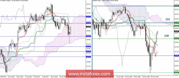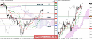 Накануне пара ограничилась незначительным торможением перед сопротивлением недельного Тенкана (129) и заключительных рубежей дневного креста Ишимоку, после чего штурмом преодолела уровни, закрыв прошлые сутки гораздо выше сопротивлений. В результате рубеж 129 на младших временных интервалах может теперь выступить в роли поддержки. Повышательным ориентиром в сложившейся ситуации является дневное облако и недельный Киджун (район 131). Преодоление данной зоны сформирует перед игроками на повышение новую цель и откроет новые перспективы для подъёма. Младшие таймы сейчас солидарны с выводами и ожиданиями старших. Действующей является цель на пробой облака Н4, исполнение которой совпадает с тестированием района сопротивлений старших таймфреймов (131). Поддержки сегодня можно отметить на 129 – 128,13 – 126,84.