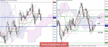 Ситуация, с момента последнего анализа, не претерпела существенных изменений. Пара продолжает оставаться в зоне влияния и притяжения встреченных сопротивлений (Сенкоу Спан А дневного облака 149 + месячные уровни 148,95). Выводы и ожидания остаются прежними. Игрокам на понижение желательно завершить подъём на текущих позициях и вернуться к взаимодействию с поддержкой верхней границы недельного облака (147,66). Основная задача для продолжения снижения – вход и закрепление в недельном облаке Ишимоку. В случае если игроки на повышение смогут добиться в ближайшее время углубления восходящей коррекции, то ключевым уровнем сопротивления сейчас по-прежнему является район 150,77 (недельный крест + дневной Киджун + Сенкоу Спан Б дней).