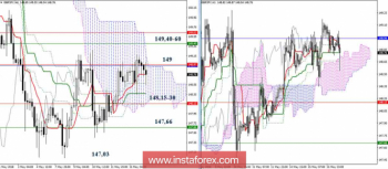 На младших таймфреймах основное сопротивление находится сейчас в границах облака Н4. Соответственно, пробой облака и надёжное закрепление выше позволят рассмотреть новые повышательные ориентиры, среди которых будет цель на пробой облака Н4 и уровни сопротивления старших временных интервалов (149,40-60). Ближайшая укреплённая зона поддержки находится в настоящий момент на 148,30-15 (заключительные рубежи креста Н4 + нижние границы облаков Н4 и Н1), далее важное значение будет иметь 147,66 (недельный Сенкоу Спан А) и обновление минимального экстремума коррекции (147,03).