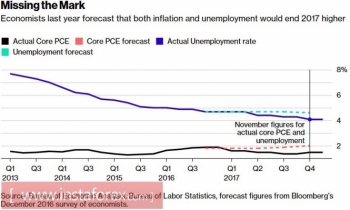 На руку «быкам» по EUR/USD сыграла неторопливая нормализация денежно-кредитной политики ФРС, обусловленная замедлением, казалось бы, набравшей в начале года хороший ход инфляции. В конце 2016 эксперты Bloomberg выставляли оптимистичные прогнозы по PCE, однако реальность оказалась другой, что наложило свой отпечаток на Федрезерв. Его «голубиная» риторика ставила палки в колеса поклонникам доллара.