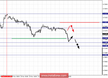 По паре Австралийский доллар/Доллар ключевыми уровнями в масштабе Н1 являются: 0.7287, 0.7254, 0.7194, 0.7169, 0.7148 и 0.7095. Здесь мы следим за формированием потенциала для нисходящего цикла от 16 ноября, на текущий момент цена близка к ключевой поддержке – 0.7287. Продолжения движения книзу ожидаем после пробоя 0.7194, в данном случае цель – 0.7169, в коридоре 0.7169 – 0.7148 консолидация цены. Пробой уровня 0.7148 должен сопровождаться выраженным нисходящим движением, здесь потенциальная цель – 0.7095, по достижении которой ожидаем откат кверху.