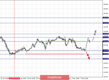 По паре Евро/Иена ключевыми уровнями в масштабе Н1 являются: 126.13, 125.86, 125.31, 125.13, 124.93, 124.48, 124.30 и 124.05. Здесь мы продолжаем следить за формированием начальных условий для восходящего цикла от 26 апреля, на текущий момент цена находится в глубокой коррекции. Возобновления движения кверху ожидаем после пробоя 124.93, в данном случае первая цель – 125.13. Краткосрочное восходящее движение ожидаем в коридоре 125.13 – 125.31, пробой последнего значения приведет к развитию выраженного движения, здесь цель – 125.86. Потенциальным значением для верха считаем уровень 126.13, по достижении которого ожидаем консолидацию, а также откат книзу.