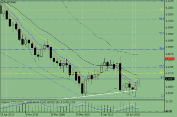Рынок пять дней пытался пробить линию поддержки 1.1566. но так и не смог этого сделать. Вероятнее всего, сегодня цена дальше будет двигаться вверх с первой целью 1.1665 – откатный уровень 14.6% (синяя пунктирная линия).