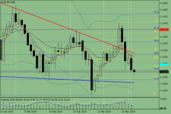 В среду цена может продолжить движение вниз. Первая нижняя цель 1.1241 – откатный уровень 76.4% (жёлтая пунктирная линия). В случае пробоя этого уровня, дальнейшее движение вниз с тестированием линии поддержки (синяя жирная линия) – 1.1224.