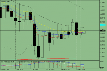 Цена в четверг, двигаясь вниз, так и не смогла преодолеть нижний фрактал 1.2618 и после этого ушла вверх. Но сильного верха из-за новостей опять же не получилось. В итоге слабое восходящее движение. Сегодня возможна работа вверх с первой верхней целью 1.2683 – 21 средняя ЕМА (чёрная тонкая линия). Сильные календарные новости ожидаются в 18.00 и 19.00 мск.