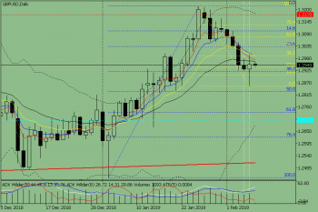 Рынок в четверг из-за новостей имел большую волатильность, но протестировать откатный уровень 50.0% — 1.29828 (синяя пунктирная линия) так и не смог. Сильных календарных новостей сегодня не ожидается.