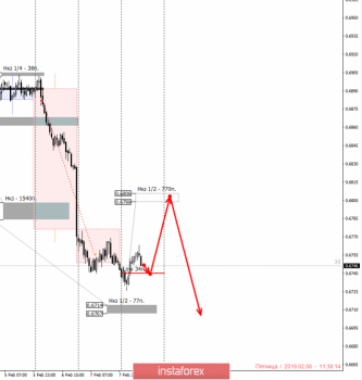 Сегодня произойдет экспирация февральского опционного контракта, что предполагает увеличение волатильности на американской сессии. Данный факт может ускорить реализацию нисходящей приоритетной модели. Вчера произошло закрепление ниже недельной КЗ 0.6798-0.6784. Следующей целью падения стала НКЗ 1/2 0.6714-0.6707. Достижение этой зоны позволит зафиксировать остатки продаж. Это необходимо сделать в связи с тем, что пара вышла за пределы недельного среднего хода.