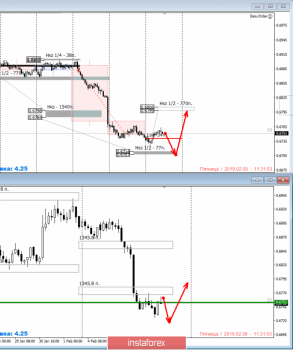 Альтернативная модель получит развитие в случае, если пара начнет рост с текущих отметок. Основным сопротивлением выступит НКЗ 1/2 0.6806-0.6799. Пока пара торгуется ниже указанной зоны, вероятность обновления локальных минимумов будет больше 70%. Достижение указанной зоны позволит получить наиболее выгодные цены на продажу инструмента. Пробой и закрепление выше уровня 0.6806 завершит нисходящий импульс и укажет на смену приоритета.