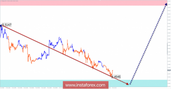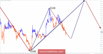 Пояснения к рисункам: В упрощенном волновом анализе используется волны, состоящие из 3 частей (А-В-С). Для анализа используется 3 основных ТФ, на каждом анализируется последняя, незавершенная волна. Зоны демонстрируют расчетные участки с наибольшей вероятностью разворота.