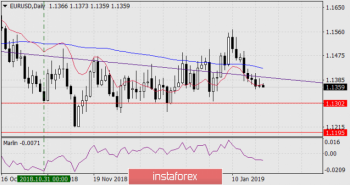 EUR/USDВчерашние торги без участия американских участников рынка прошли спокойно, инвесторы проигнорировали как позитивные китайские данные, так и ослабленные европейские. Объём промышленного производства в Китае в декабре показал рост на 5,7% г/г против 5,4% г/г в ноябре, розничные продажи увеличились с 8,1% г/г до 8,2% г/г. В Германии индекс цен производителей в декабре снизился на -0,4%. Евро был удержан под линией баланса дневного таймфрейма. Сегодня индекс настроений в деловых кругах Германии ZEW за текущий месяц ожидается ухудшением с -17,5 до -18,8, аналогичный индикатор по еврозоне в целом прогнозируется чуть лучшим: -20,1 против -21,0 в ноябре. Но более значимых поводов к оптимизму нет, поэтому евро продолжит снижение, начатое 10 января. На графике четырёхчасового масштаба сигнальная линия осциллятора марлин разворачивается вниз от границы с зоной роста. Цель 1.1302 – минимум 31 октября. Закрепление под уровнем открывает перспективу снижения к 1.1195.