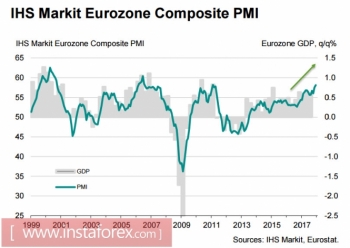 Рост деловой активности в странах еврозоны продолжает ускоряться. По данным IHS Markit, композитный индекс достиг в декабре уровня 58.1п, что превышает ноябрьские 57.5п, и является максимумом с февраля 2011г.