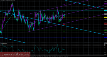 Исходя из анализа серебра 24 ноября, следует, что цена продолжает располагаться выше мувинга, но продолжить движение вверх пока не в состоянии. Старший канал направлен вниз, что свидетельствует о нисходящем направлении глобального тренда. Младший канал направлен вверх, что означает восходящую тенденцию в краткосрочном плане. В данный момент цена находится выше мувинга и выше уровня Мюррея «7/8», что делает более вероятным продолжение восходящего движения. Первой целью для движения вверх сейчас является уровень Мюррея «8/8» — 17,188. Если цена преодолеет этот уровень, то следующей актуальной целью для движения вверх будет выступать уровень Мюррея «+1/8» — 17,383. Скользящая средняя линия направлена вверх, а цена располагается вверх нее, что сигнализирует о текущем восходящем уклоне. Хайкен Аши окрасил последние бары в фиолетовый цвет, что сигнализирует о текущем восходящем движении. Окрас 1-2 баров в голубой цвет будет означать очередной виток коррекции. Шорты можно будет рассматривать ниже скользящей средней линии и ниже уровня Мюррея «7/8» с целью уровень Мюррея «6/8» — 16,797. Индикатор CCI находится около уровня 100, что сигнализирует о слабой перекупленности инструмента.