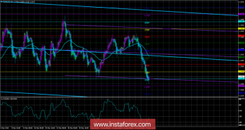Курс евро/доллар на валютном рынке 24 апреля продолжает уверенное движение вниз и отработал уровень Мюррея «0/8». Старший канал направлен вниз, что свидетельствует о нисходящем направлении глобального тренда. Младший канал также развернулся вниз, что означает нисходящую тенденцию и в краткосрочном плане. На данный момент цена находится ниже мувинга и ниже уровня Мюррея «1/8». Поэтому целью для нисходящего движения сейчас является уровень Мюррея «0/8» — 1,2207, который уже достигнут. В случае преодоления этого таргета, следующей целью будет выступать уровень Мюррея «-1/8» — 1,2177. Скользящая средняя направлена вниз, а цена находится ниже нее, поэтому в ближайшее время более актуально нисходящее движение. Хайкен Аши окрасил последние бары в голубой цвет, что говорит нам о локальном нисходящем движении, разворот индикатора наверх укажет на начало восходящей коррекции, ордера на продажу станут на время не доступными для открытия. Лонги можно будет рассматривать только после разворота наверх любого канала и закрепления цены выше мувинга. Индикатор CCI находится около уровня -100, что говорит о наличие слабой перепроданности валютной пары, в ближайшее время ожидается восходящая коррекция.