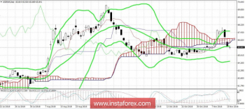 Технически индикатор Ichimoku Kinko Hyo на дневном графике сформировал медвежий сигнал «Парад линий», а цена находится между средней и нижней линиями индикатора Bollinger Bands. Такое сочетание говорит о приоритете нисходящего движения к первому наиболее сильному уровню поддержки 65,0. Если фундаментальный фон будет способствовать дальнейшему укреплению рубля, то пара может опуститься к следующему уровню поддержки, которая соответствует отметке 64,40 (нижняя линия Bollinger Bands на дневном графике).