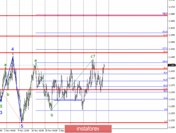 Торги в четверг, 27 декабря, завершились для пары EUR/USD ростом на 80 б.п. Таким образом, если волна с действительно завершена, то пара перешла к построению предполагаемой волны d или же вовсе нового понижательного участка тренда. Так или иначе, ниже максимума волны с сохраняется неплохая вероятность снижения инструмента с целями, расположенными вблизи уровня 0,0% по Фибоначчи. Прорыв максимума волны с может привести к усложнению внутренней волновой структуры этой волны и дальнейшему росту.