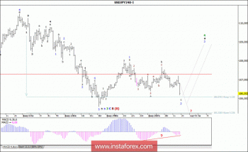 Инструмент продолжает построение долгосрочного восходящего участка тренда. Понижение котировок может продолжиться с целями, находящимися на подходе к отметке 106,07, что соответствует 423,6% по Фибоначчи, в рамках построения волны 2, в а, в 4, в С, в С, в (В). После завершения этой волны может возобновиться повышение котировок в рамках импульсной волны 3 с целями, находящимися существенно выше 108 фигуры. Конвергенция MACD_ака предупреждает о готовности инструмента к повышению.Материал предоставлен компанией InstaForex — www.instaforex.com