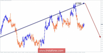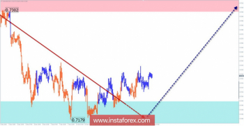 До уточнения текущей волновой картины торговые сделки проводить не рекомендуется. При подтверждении смены курса сигналы разворота нужно отслеживать в районе зоны сопротивления.