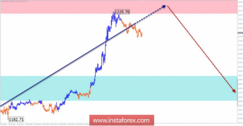 Пояснения к рисункам: В упрощенном волновом анализе используется волны, состоящие из 3 частей (А-В-С). Для анализа используется 3 основных ТФ, на каждом анализируется последняя, незавершенная волна. Зоны демонстрируют расчетные участки с наибольшей вероятностью разворота.